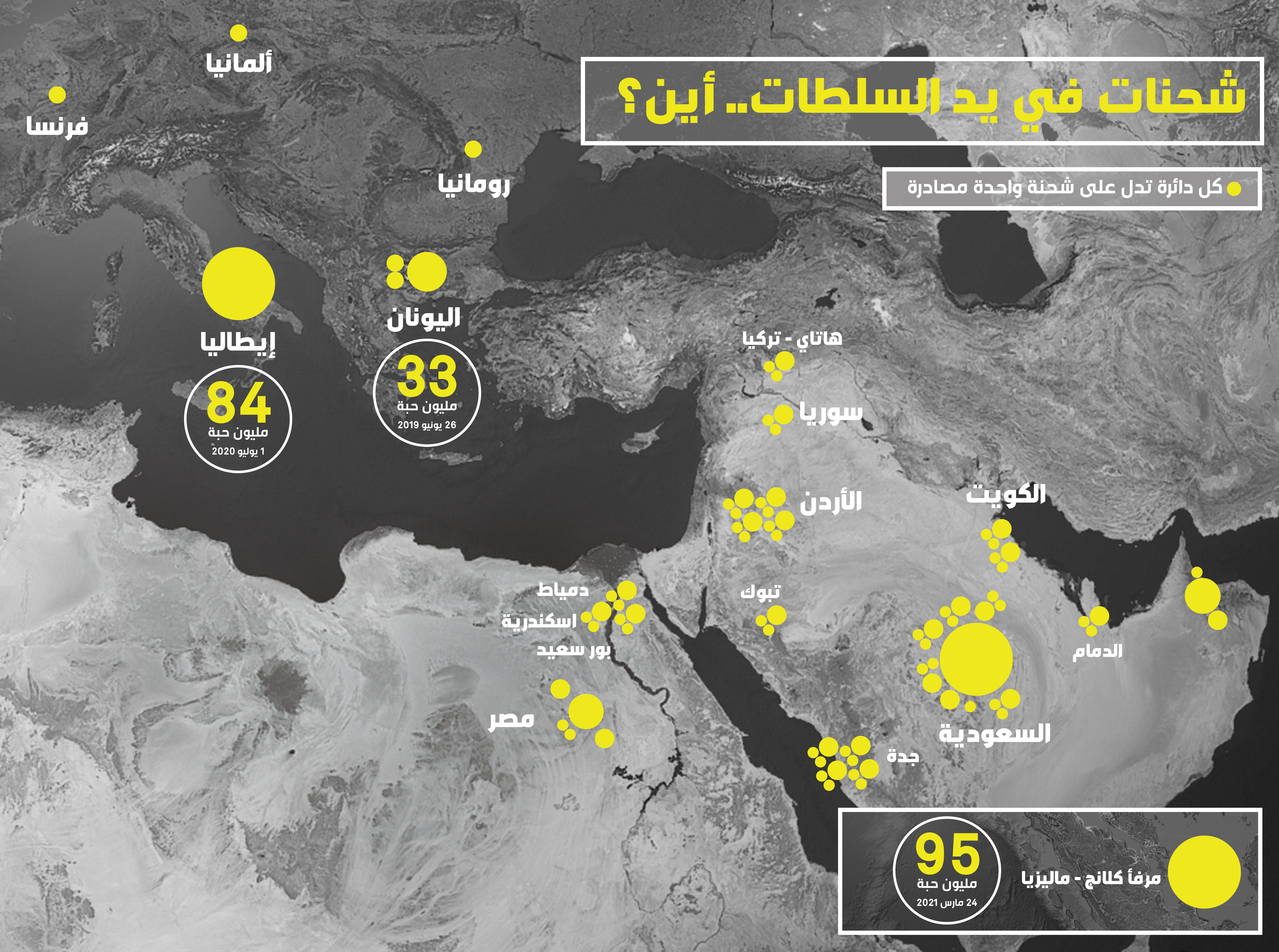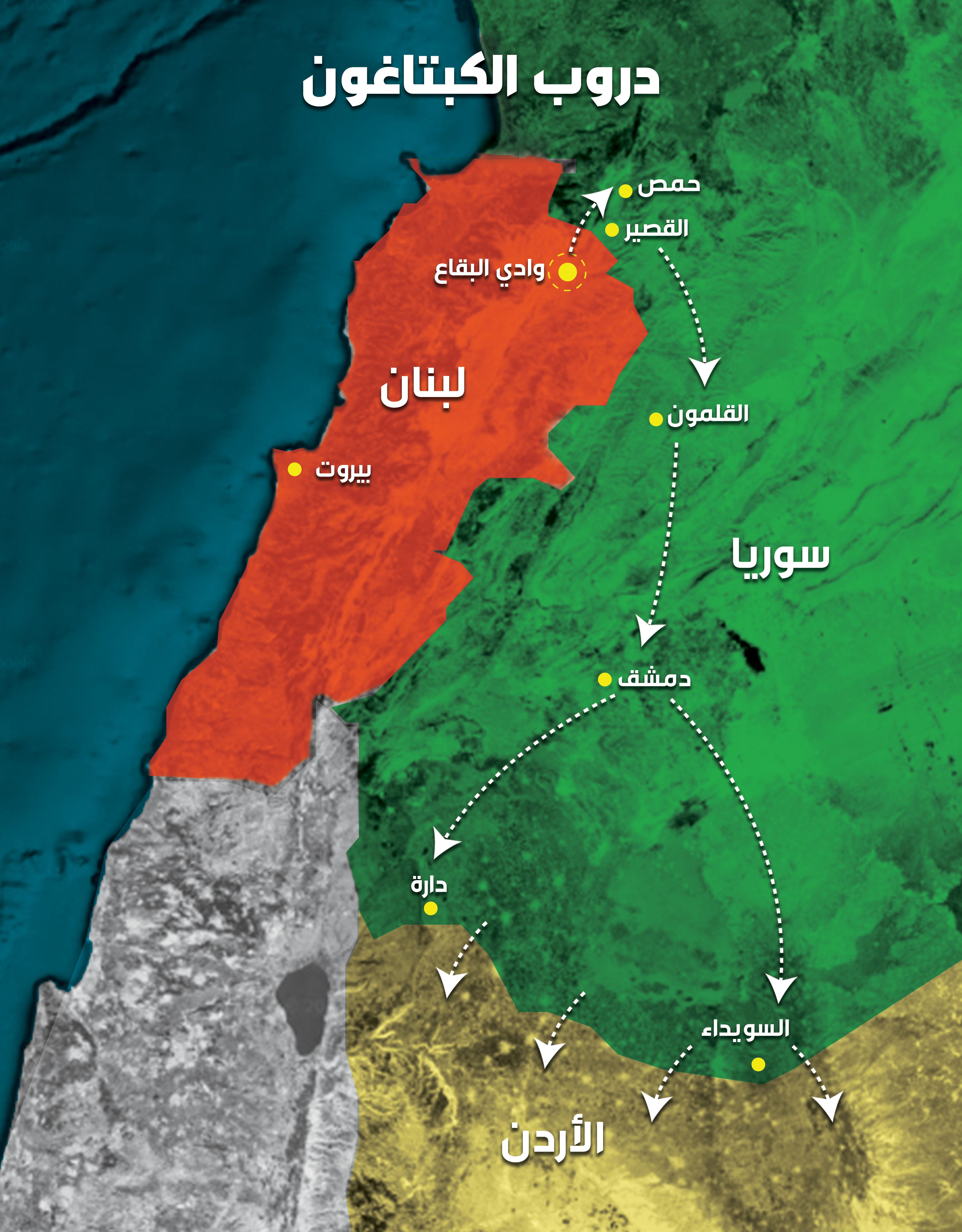 من دول مصنعة كسوريا والحدود اللبنانية– السورية إلى دول تعتبر محطة عبور مثل الأردن والعراق وتركيا، التي غالباً ما تستخدم لإيصال الشحنات إلى الواجهة الأساسية في الخليج العربي حيث تعتبر السعودية المستهلك الأول لهذه الحبوب المخدرة.