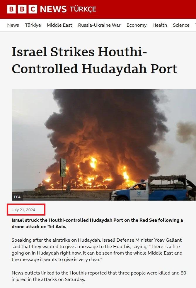 ففي العشرين من تموز/يوليو 2024، أغارت مقاتلات إسرائيلية على أهداف للحوثيين في الميناء غداة تبنّيهم هجوماً بمسيّرة مفخّخة أوقع قتيلاً واحداً في تل أبيب.
