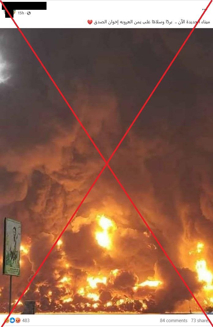 تظُهر الصورة حريقاً ودخاناً كثيفاً. وجاء في التعليقات المرفقة أن الصورة تُظهر "ميناء الحُديدة الآن". وظهرت هذه المنشورات ليل الخميس الجمعة، عقب قصف أميركي هو الأكثر دمويّة منذ إطلاق واشنطن حملتها ضدّ اليمن قبل أسابيع.