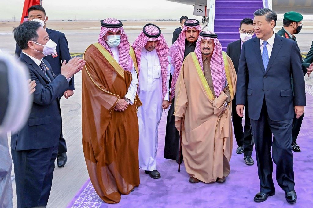 أمير منطقة الرياض الأمير فيصل بن بندر آل سعود مستقبلاً الرئيس الصيني شي جين بينغ في مطار الملك خالد الدولي بالرّياض (أ ف ب).
