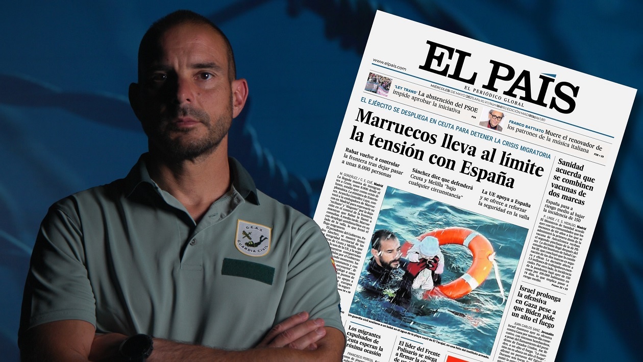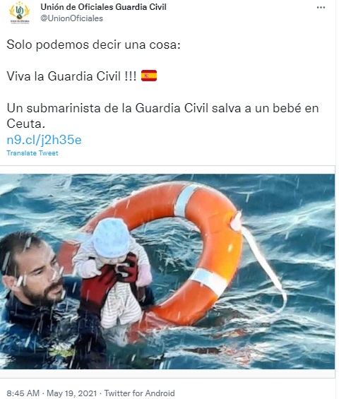 فالبحث العكسيّ عنها يقودنا إلى خيوط (هنا، هنا...)، توصلنا إلى مصدرها الرئيسيّ، حساب "نقابة ضباط الحرس المدني" الإسبانيّة على "تويتر"، التي نشرتها في 19 أيار (مايو) 2021 (هنا)، مع شرح بالكتالونية: "غواص من الحرس المدني ينقذ طفلاً في سبتة".