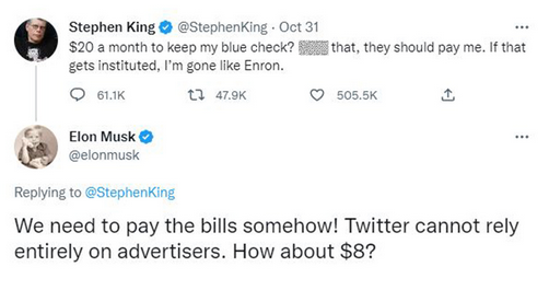 وأبدى كينغ امتعاضه من دفع 20 دولاراً شهرياً كرسوم لقاء حصوله على العلامة الزرقاء، ليوضح له ماسك بأنّ السبب وراء ذلك هو عدم إمكانية التعويل على أموال الإعلانات وحدها، وليسأله عن رأيه في تخفيض الرسم إلى 8 دولارات.