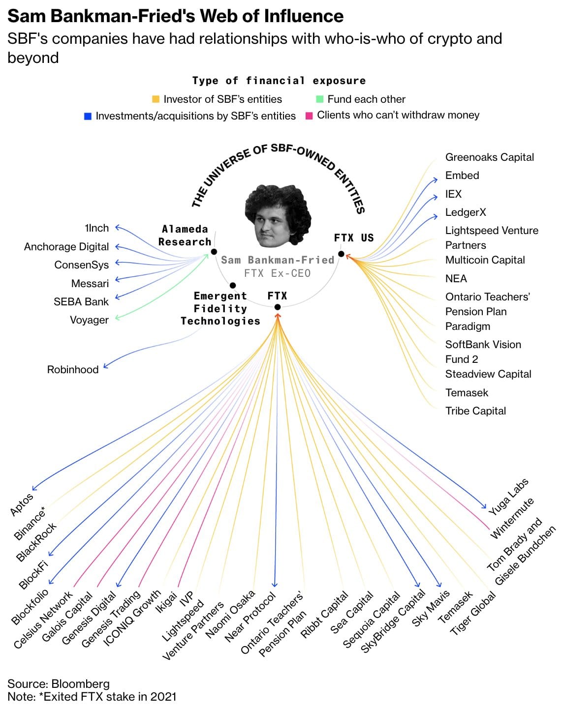 وفي حديث لـ"النهار العربي"، وصف خبير العملات الرقمية رودي شوشاني أزمة FTX بالصندوق الأسود، نظراً لعدد المستثمرين الكبير في المنصة، من بينها شركات كبرى استخدمت أموالها بطريقة غير أخلاقية ستتأثر حكماً بهذه الأزمة، كما هو موضح في الرسم أدناه: