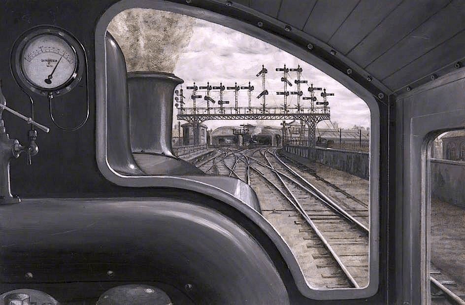 هذه الآلةُ البخارية الضخمة وُلِدت في إِنكلترا (محصورة سنة 1825 ثم عامَّة سنة 1830)، وما زال القطار فيها أَكثر الوسائل شعبيةً وعراقة. من هنا أَن الرسامين الإِنكليز كانوا بين بأَوائل من رسموا محطاته محطاته الكبرى والأَقدم.