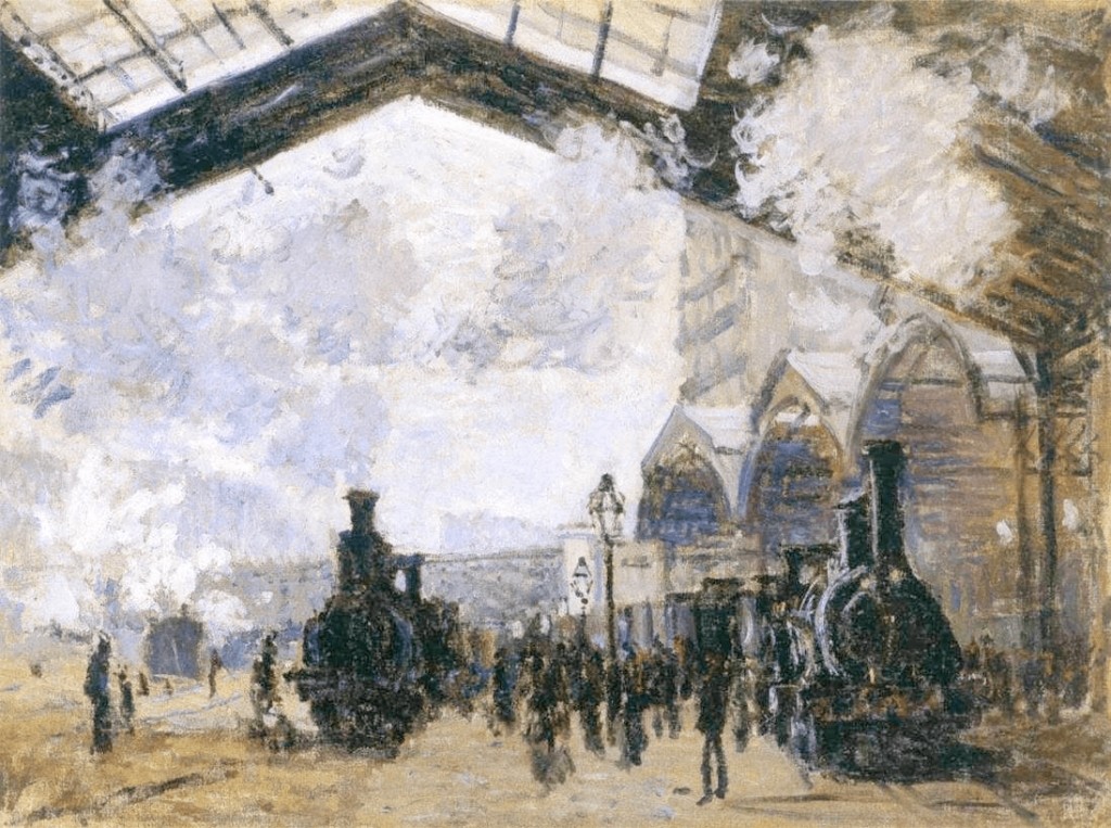 حين بدأَ القطار أَن يكون وسيلة نقلٍ، محصورةً ثم شعبيةً، في عدد من بلدان العالَم الغربي، باتت محطاتُه واحاتٍ للقاءِ المسافرين في كل اتجاه، وراحت تكثر فيها المحالُّ التجارية والمخازن الكبرى والمكتبات. ومع الوقت، أَخذَت تلك المحطات تستقطب الرسامين يلتقطون فيها ومنها مناظرَ الناس ومشاهدَ القطارات في دخولها المحطة وخروجها منها.