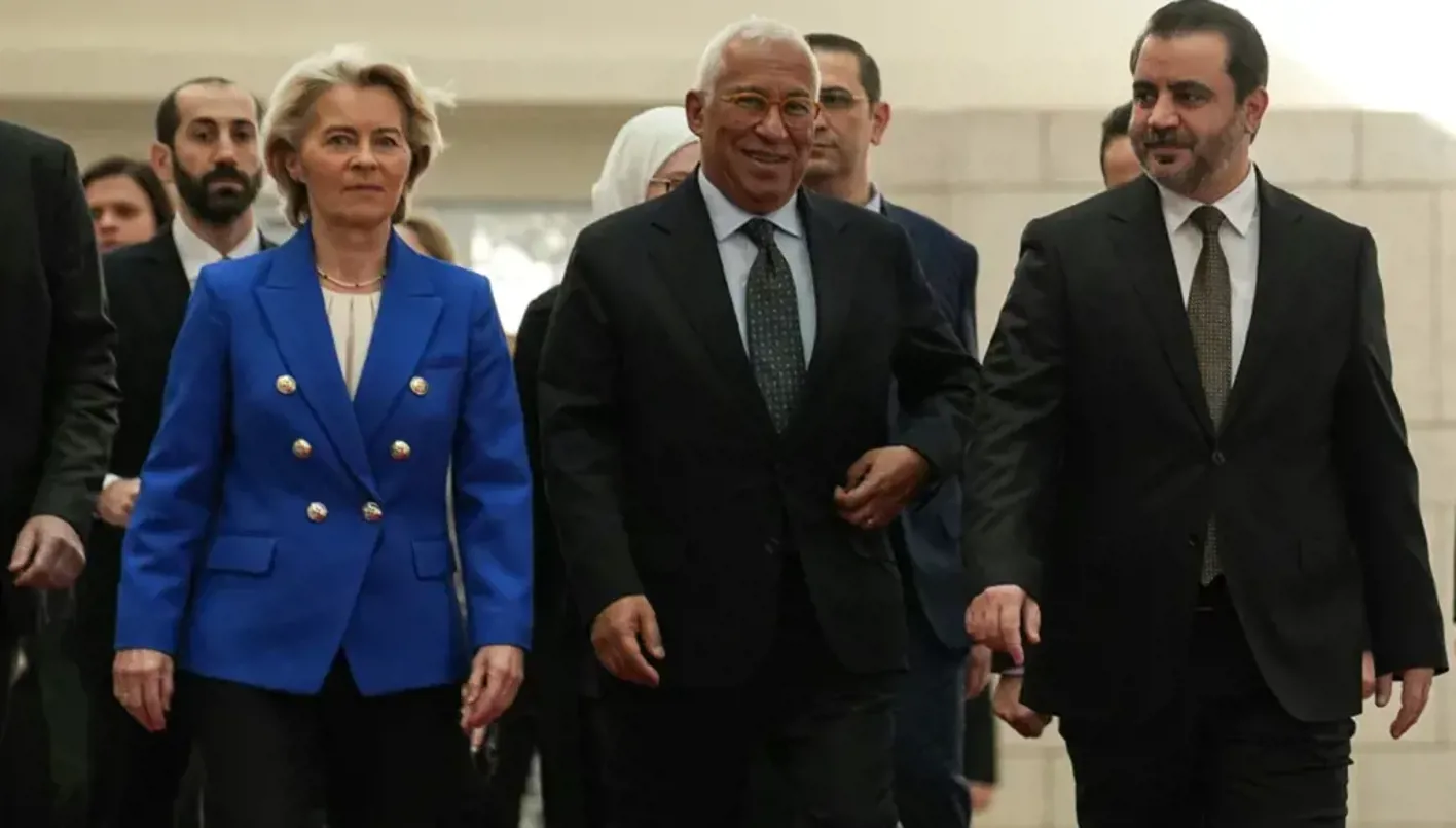 SANA a rapporté qu'al-Sharaa a rencontré le président du Conseil européen António Costa et la présidente de la Commission européenne Ursula von der Leyen, ainsi que leur délégation, au palais du peuple à Damas.