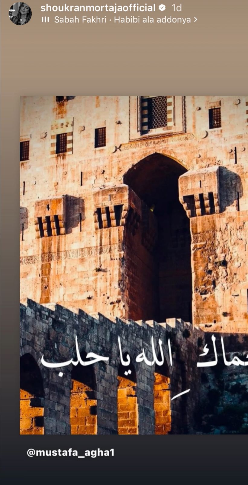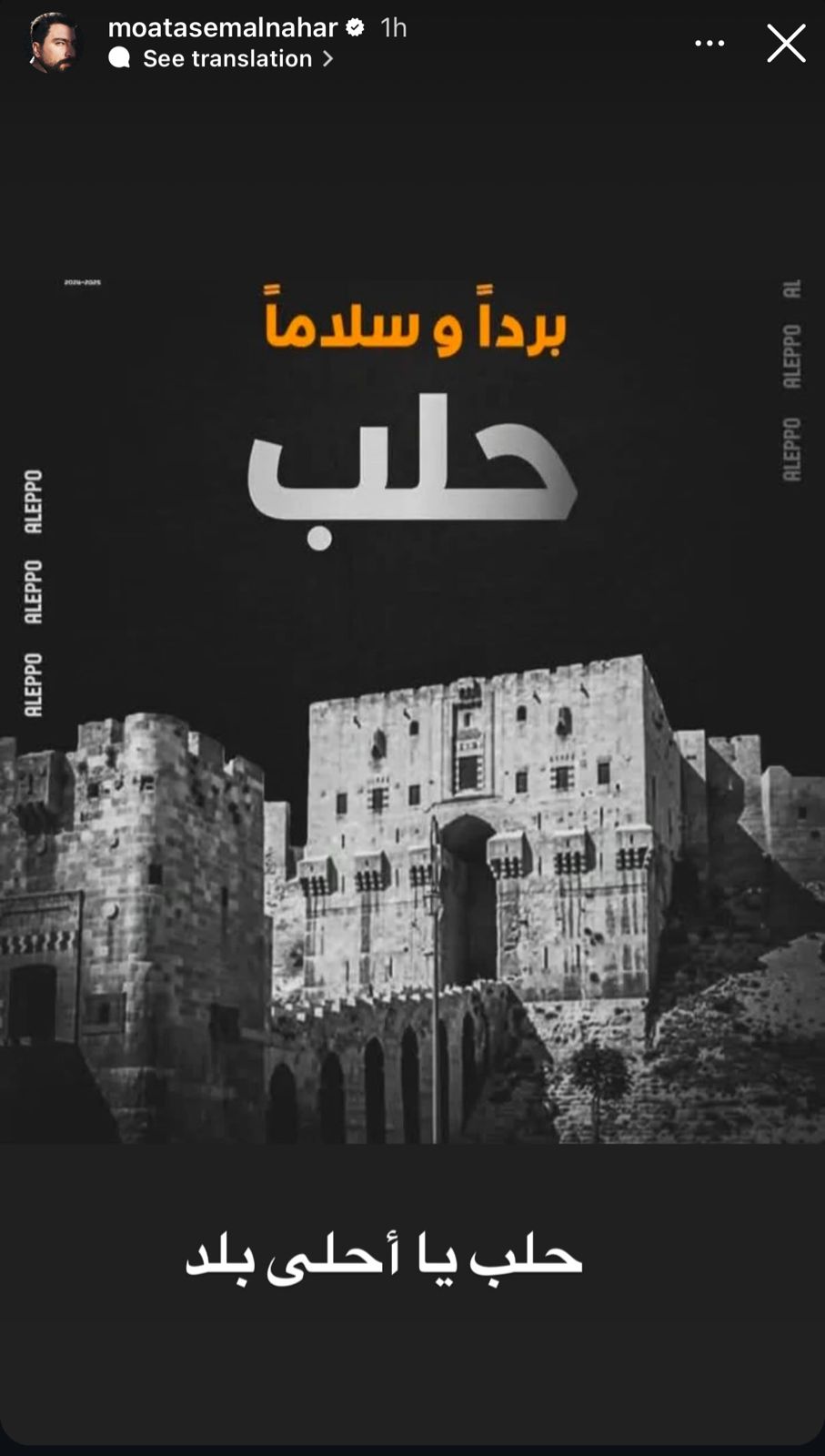 شارك الإعلامي السوري مصطفى آغا صورة تعبيرية لحلب كتب عليها "حماك الله يا حلب"، عبر حسابه الرسمي في "إنستغرام"، وأرفقها بتعليق: "الله يحمي حلب وأهلها، حمى الله حلب وكل سوريا وكل بقعة نحبها في بلادنا العربية".