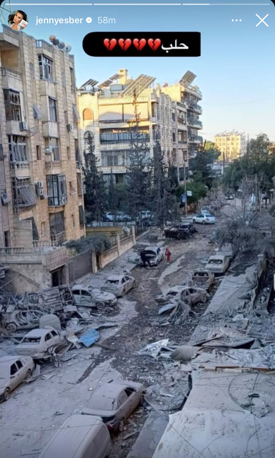 وشاركت الممثلة جيني إسبر صورة تُظهر الدمار في حلب عبر خاصية القصص المصورة في حسابها الرسمي في "إنستغرام"، أرفقتها برموز قلوب مكسورة.