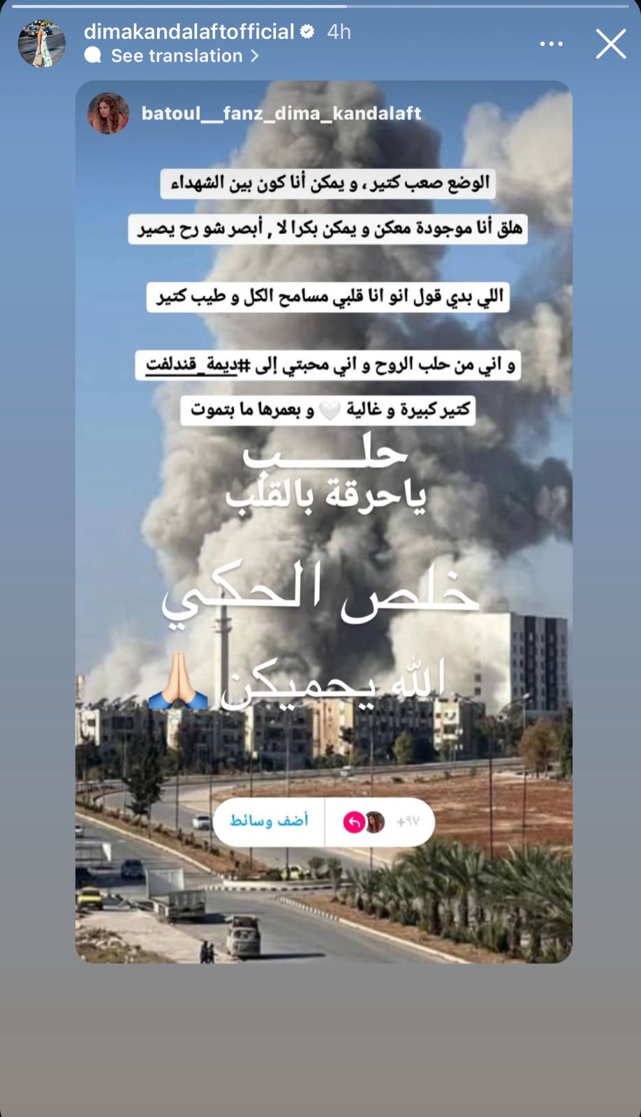 أما الممثّلة ديما قندلفت فأعادت مشاركة منشور لفتاة تدير حساباً لمعجبيها، جاء فيه: "الوضع صعب جداً، ومن الممكن أن أكون بين الشهداء، الآن أنا موجودة معكم، ويمكن بكرا لا، لا أدري ماذا سيحدث".