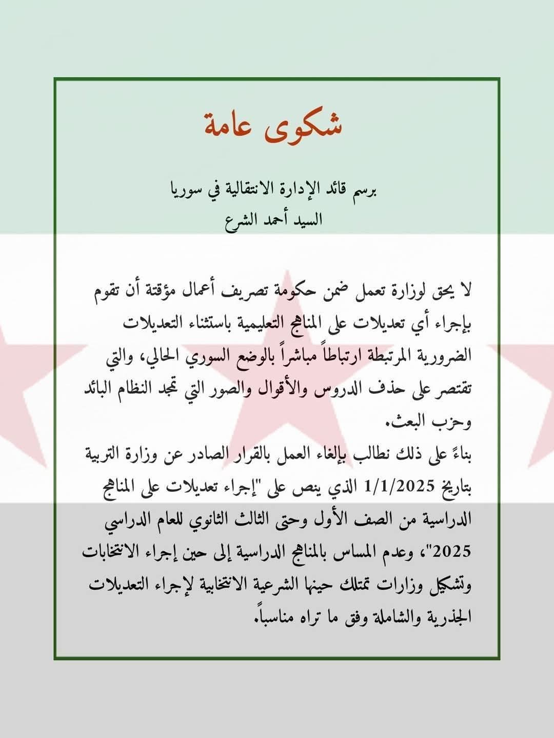 وتداول قسم كبير من الفنانين منشوراً موجّهاً إلى "قائد الإدارة الانتقاللية السيد أحمد الشرع"، جاء فيه: "لا يحقّ لوزارة تعمل ضمن حكومة تصريف أعمال موقتة أن تقوم بإجراء أيّ تعديلات على المناهج التعليمية"، باستثناء الضرورية المرتبطة بالوضع الحالي، والتي "تمجّد النظام البائد وحزب البعث". وطالب المنشور بإلغاء قرار التعديلات و"عدم المساس بالمناهج الدراسية إلى حين إجراء الانتخابات وتشكيل وزارات تمتلك الشرعية الانتخابية حينها".